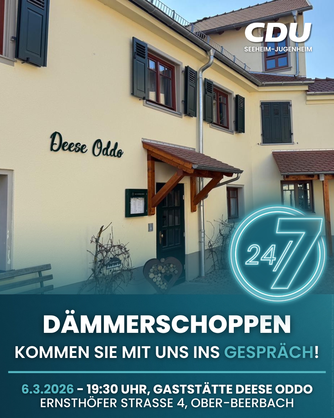 Die CDU Seeheim-Jugenheim lädt herzlich zu einem Dämmerschoppen zur Kommunalwahl ein, der am Freitag, den 6. März 2026, um 19:30 Uhr im Deese Oddo in der Ernsthöfer Straße 4 in 64342 Seeheim-Jugenheim/ Ortsteil Ober-Beerbach stattfindet.