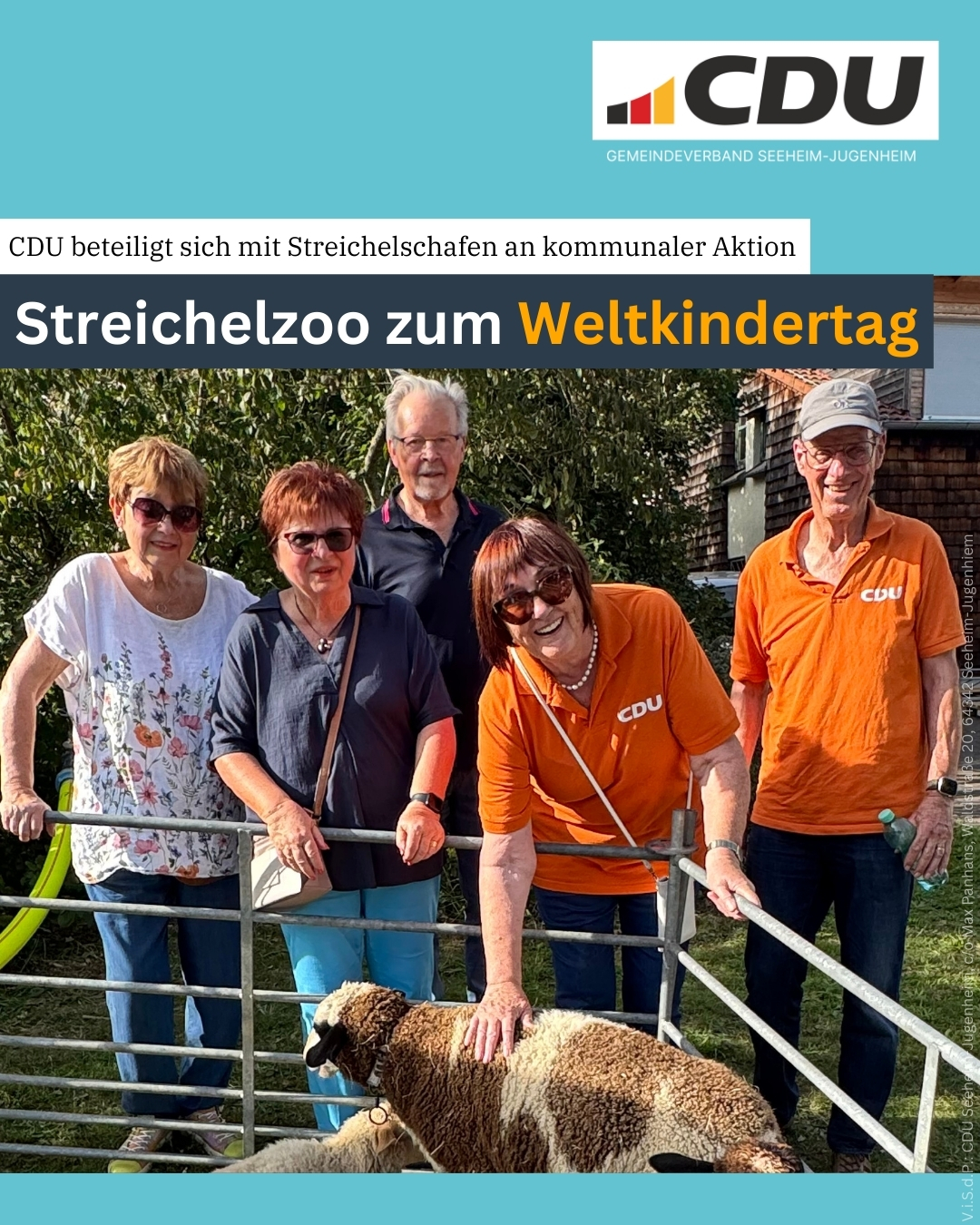 Am vergangenen Wochenende stand Seeheim-Jugenheim ganz im Zeichen des Weltkindertags. Wie in jedem Jahr organisierte die Gemeinde ein buntes und familienfreundliches Fest, bei dem Kinder im Mittelpunkt standen. Die CDU Seeheim-Jugenheim war mit einem eigenen Stand vertreten, einem Streichelzoo mit Schafen vom Schafhof Drachenhöhle aus Ober-Beerbach.