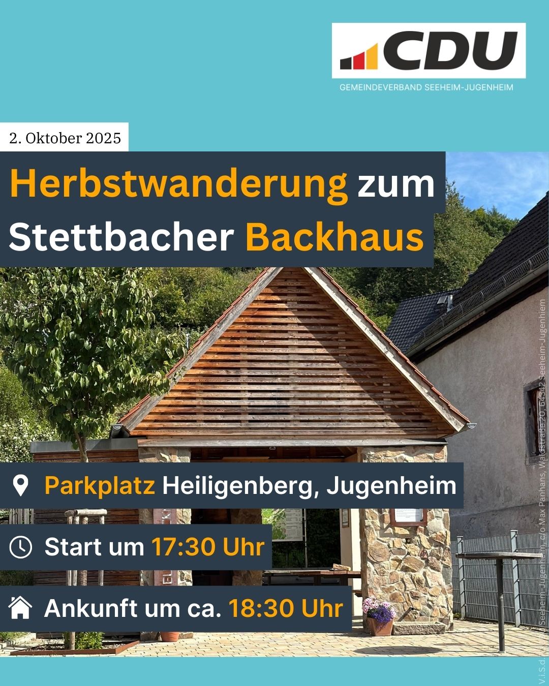 Am Donnerstag, den 2. Oktober 2025, lädt die CDU Seeheim-Jugenheim alle Bürgerinnen und Bürger sowie Interessierte herzlich zu einer herbstlichen Wanderung mit anschließendem Beisammensein ein. Ziel der Wanderung ist das idyllisch gelegene Backhaus in Stettbach, das an diesem Abend ganz im Zeichen von Genuss und Austausch stehen wird.
